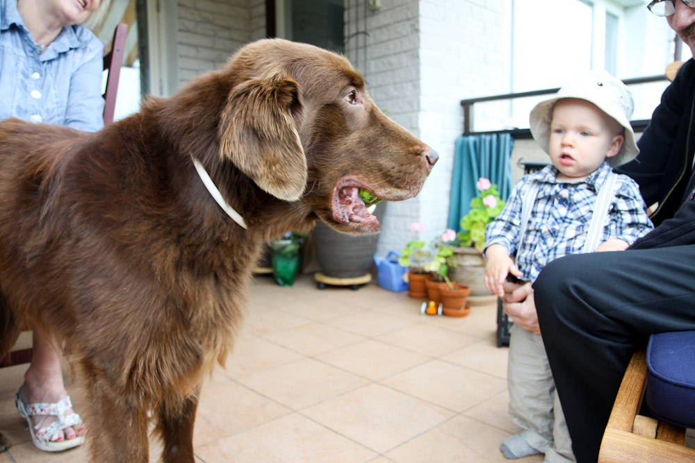 Kyläpaikassa oli myös ihastuttava haukkutoveri Puzzel, joka suuresta koostaan huolimatta ei ollut liian pelottava Teevinkään mielestä. Teevi kävikin myös koeajamassa Puzzelin pedin.