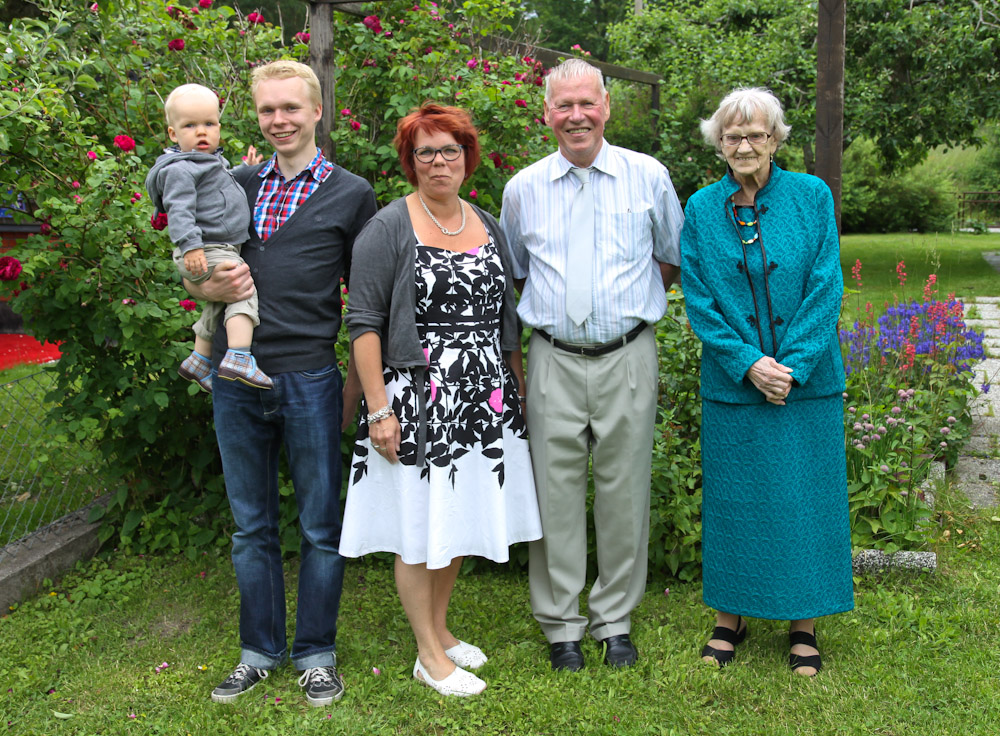 Iltapäivällä olikin juhlan aika. Juhlia on tänä keväänä ja kesänä ollut jo varsin monet, joten täytekakku ja mansikat olivat pikkumiehelle jo tuttuja herkkuja. Juhlan tiimellyksessä kuvattiin taas kaikki viisi polvea, edelliset kuvat otettiin vuosi sitten, Teevin ristiäisissä.