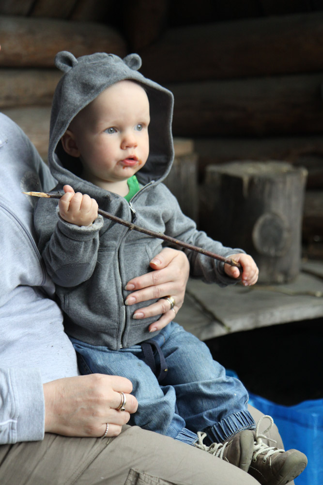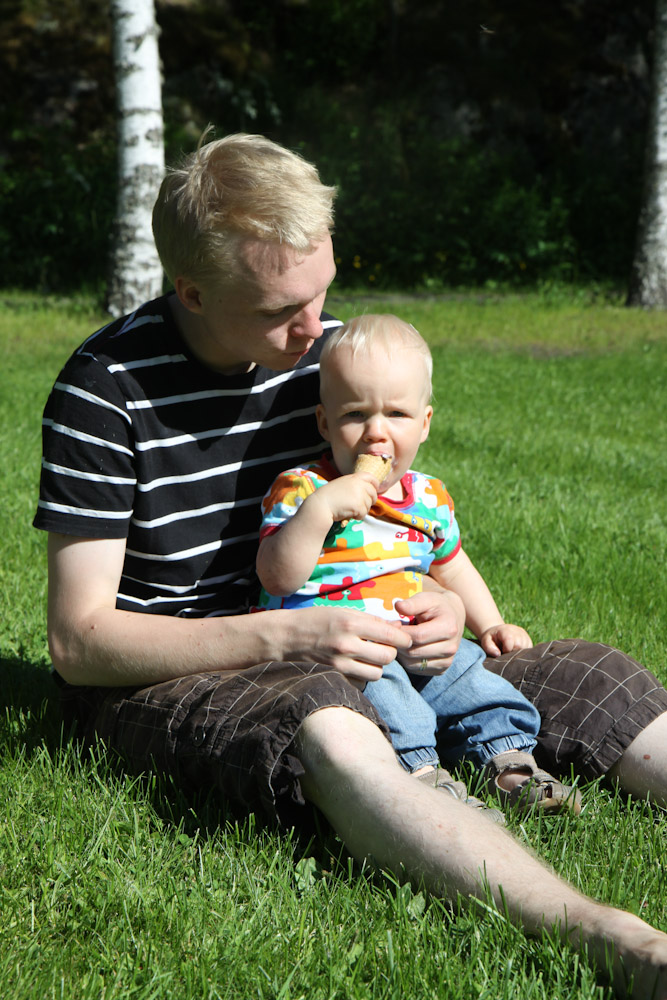Viime viikonloppua vietettiin vaarilassa, mun isän luona Espoossa. Siellä otettiin rennosti (kuten kuvasta näkyy), saunottiin, käytiin katsomassa alamäkiluistelua, leivottiin kakkua ja tehtiin tuttavuutta erikokoisten eläinten kanssa. Teevin lemppari on ”mauuu” eli kissa. Teevi seurailee kissoja ja silittelee niitä mielellään. Meidän oma mau asustaa tällä hetkellä Rauman mummulassa, koska me on reissattu sen verran paljon ja jossain vaiheessa Teevin ja Bitin yhteiselo ei oikein sujunut, kun Teevi repi kissaneitiä aina hännästä. Vaikka Bitti on maailman kiltein kissa ja sitä melkein saakin kantaa hännästä, ei sekään ihan kaikkea kestänyt. Osa huitovista pikkukäsistä tulkittiin väärin ja silitystä tavoittelevat sormet saivat kynnestä. Lisäksi Bitti oppi ärsyttämään Teeviä makaamalla puolen metrin päässä, jotta Teevi tulisi koskemaan. Nyt pitäisi miettiä, saako Bitti jäädä maalle asumaan vai otetaanko mau takaisin kotiin. Ainakin Teevi olisi ikionnellinen omasta mausta. Täytyisi kokeilla, miten lomafiilistelijä sopeutuisi takaisin kaupunkiasujaksi. Ulos kun ei pääse ilman hihnaa täällä meillä. Kyllä meillä kaikilla on sitä ainakin ikävä.